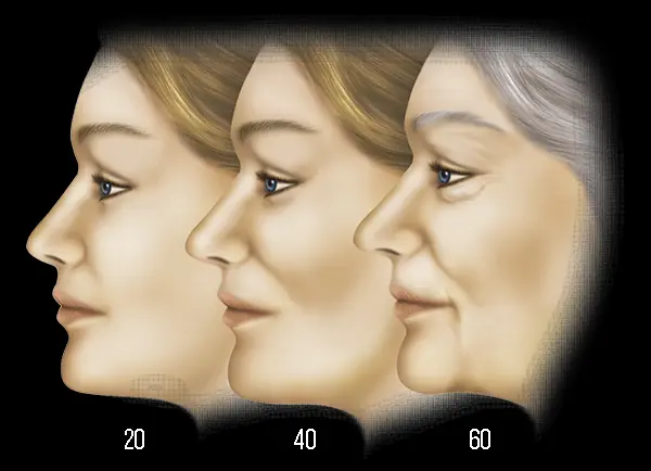 Na figura abaixo, vemos a queda da ponta nasal com o envelhecimento.